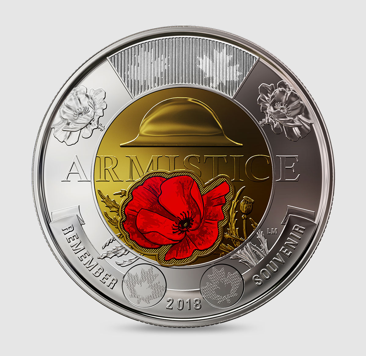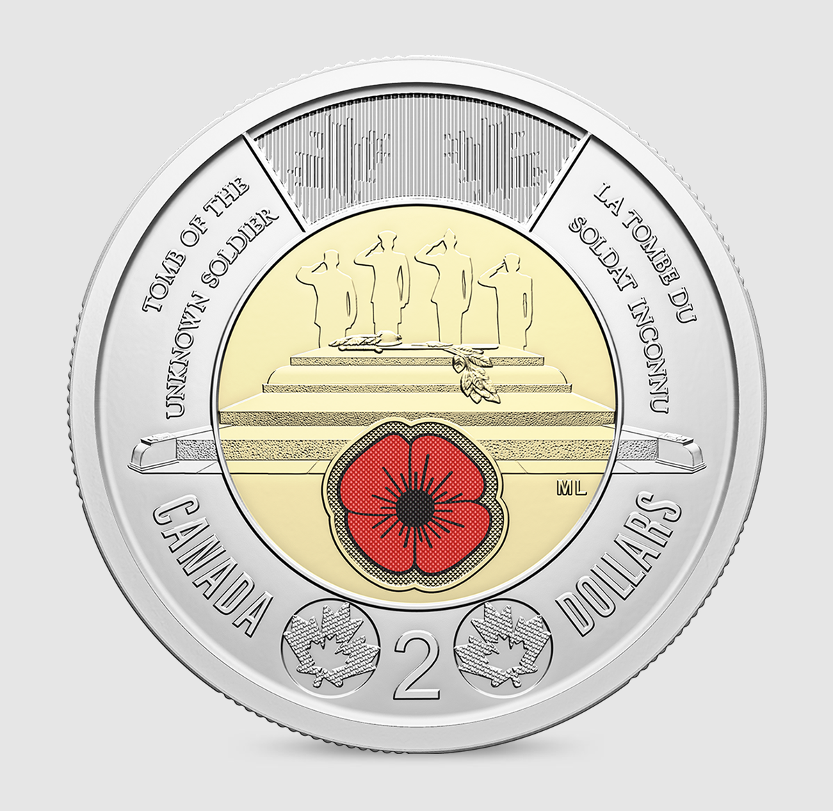 A reverent salute to all who have served and continue to serve our country, the commemorative $2 circulation coin honours the 25ᵗʰ anniversary of the repatriation of Canada’s Unknown Soldier.