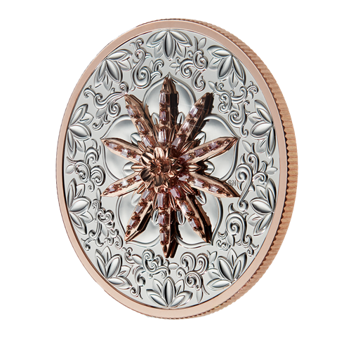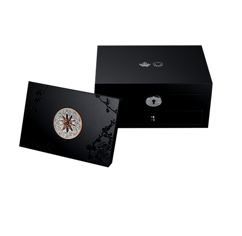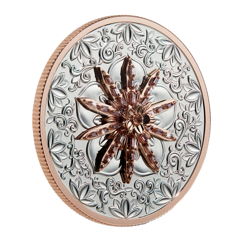 This pure platinum coin is adorned with 30 pink diamonds from the legendary Argyle mine graded as Fancy Vivid and Fancy Intense. Set into rose gold-plated enhancements, these ultra-rare gemstones exude class and sophistication from the centre of the coin,which perfectly combines artistry, craftsmanship and the most precious materials in order to deliver luxury on a grand scale.