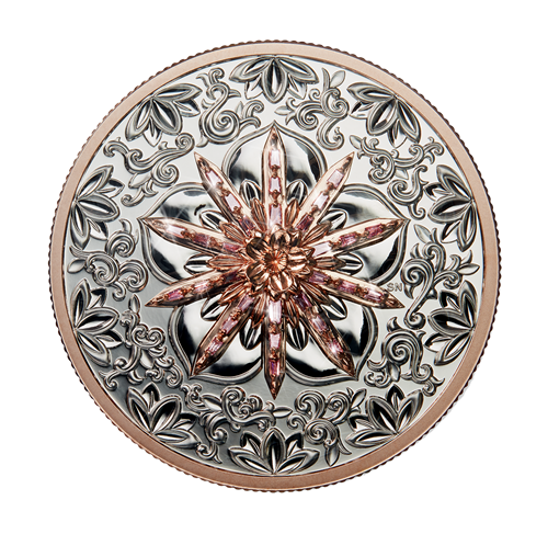 Coveted for their vibrant colour and sparkle, 30 Pink diamonds from the Argyle diamond mine graded as Fancy Vivid and Fancy Intense (a total carat weight of 0.34) adorn your coin’s reverse. Coveted for their vibrant colour and sparkle, these ultra-rare pink diamonds come from the famous Argyle mine and are part of a limited collection that took over three decades to collect.