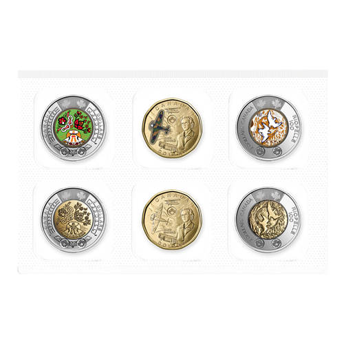 On the inside of the front cover is a Special Edition Uncirculated Set that is a book exclusive! Enclosed in a mylar coin flip, the six coins represent the year’s biggest commemorations: two $2 National Indigenous Peoples Day coins (colourized and non-colourized); two $2 100th Anniversary of the Birth of Jean Paul Riopelle coins (colourized and non-colourized) and two $1 Honouring Elsie MacGill coins (colourized and non-colourized).