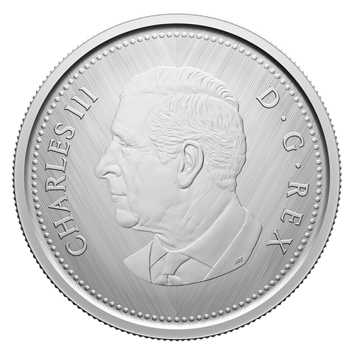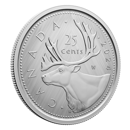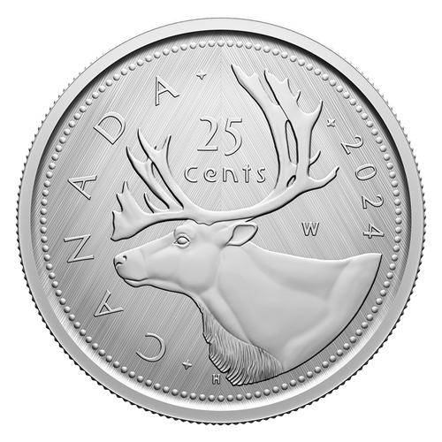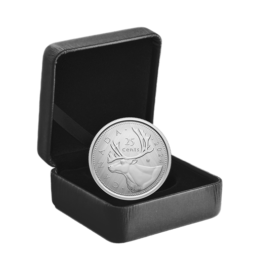 A numismatic tribute to Canada’s 25-cent circulation piece, this all-silver coin’s reverse features Emanuel Hahn’s caribou design, along with the “W” (Winnipeg) mint mark denoting where this coin was struck. The obverse features the effigy of His Majesty King Charles III by Canadian artist Steven Rosati.