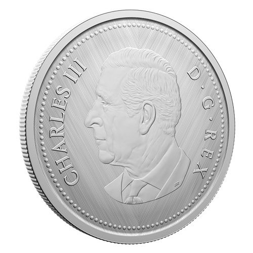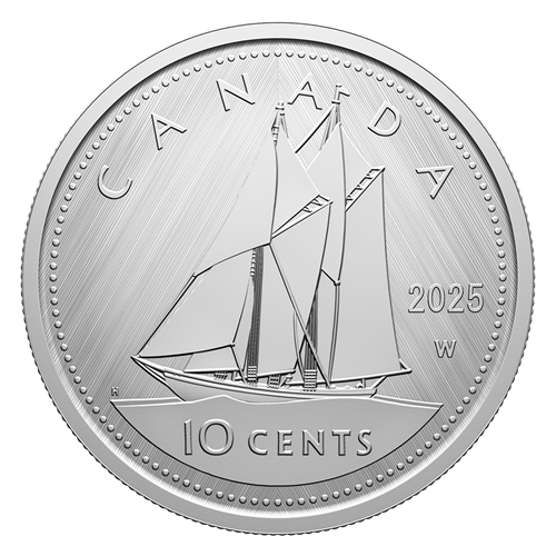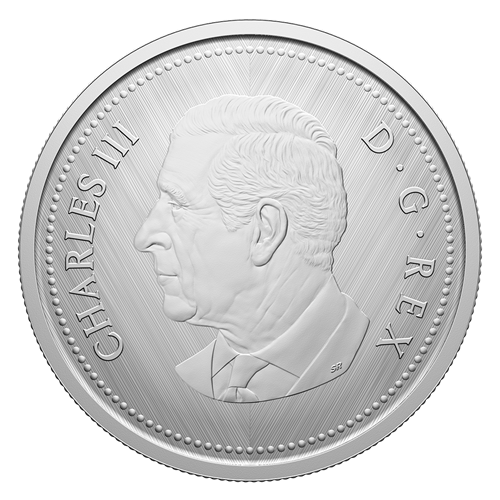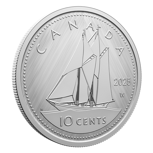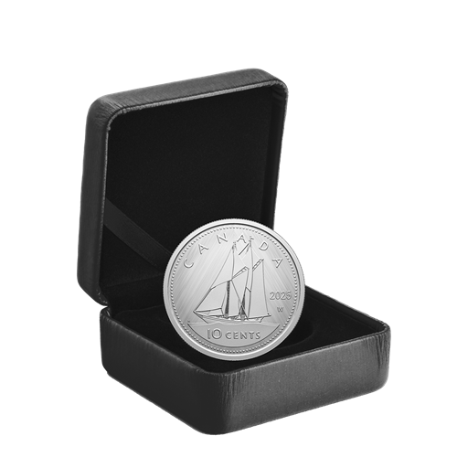 A numismatic tribute to Canada’s 10-cent circulation piece, this all-silver coin’s reverse features Emanuel Hahn’s depiction of the iconic Bluenose fishing schooner under sail, along with the “W” (Winnipeg) mint mark denoting where this coin was struck. The obverse features the effigy of His Majesty King Charles III by Canadian artist Steven Rosati.