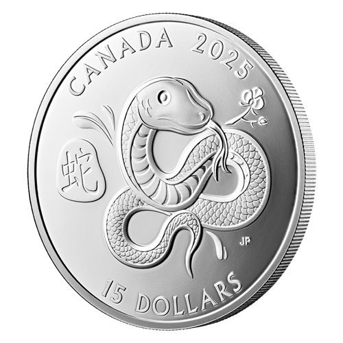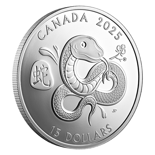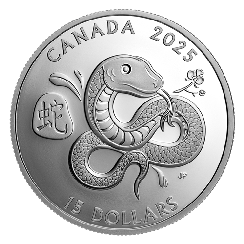 Inspired by traditional Chinese folk art, the reverse design by Canadian artist Jai Paek celebrates the Year of the Snake (2025) by presenting the Chinese zodiac animal with its lucky flower, the orchid. Orchid leaves and branches are positioned around its form so the Snake appears to be part of a tree, thus representing the Wood element in 2025. its head faces East – a lucky direction for the Snake – while its coiled body forms the shape of the luckiest number in Chinese culture, eight (8), which is associated with wealth and prosperity. The reverse also includes the Chinese character for “snake”, along with the word “CANADA”, the year “2025” and a face value of “15 DOLLARS”. The obverse features the effigy of His Majesty King Charles III by Canadian artist Steven Rosati.