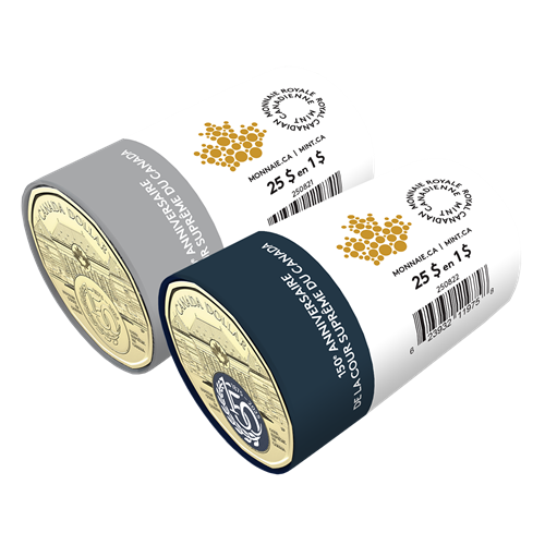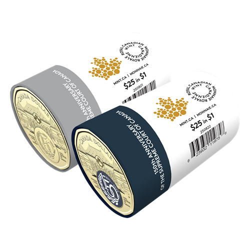 NEW for 2025: Two rolls and two encapsulated coins in one box set. Each colourized special wrap roll adds 25 colourful commemorative $1 coins to your collection, but with this special wrap roll set, you get TWO different versions of the 150th Anniversary of the Supreme Court of Canada coin: one special wrap roll of 25 colourized coins, and one special wrap roll of 25 non-colourized coins. Inside the presentation box, your two rolls come nestled in a custom foam insert alongside two encapsulated coins (one of each version)—a new addition that makes it easier for you to view the designs and put either side of the coin on display.