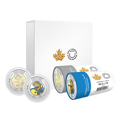 Each Colourized Special Wrap Roll adds 25 colourful commemorative $2 coins to your collection, but with this Special Wrap Roll Set, you get TWO different versions of the Celebrating the Life and Art of Daphne Odjig coin: one Colourized Special Wrap Roll, and one Special Wrap Roll of 25 non-coloured coins. Inside the presentation box, your two rolls come nestled in a custom foam insert alongside two encapsulated coins (one of each version)—a new addition that makes it easier for you to view the designs and put either side of the coin on display.