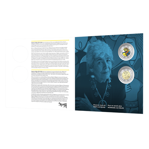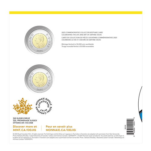 - New format. Redesigned in 2024 to keep the focus on the commemorative theme, each Commemorative Collector Keepsake Card contains two (2) uncirculated coins: a colourized $2 Celebrating the Life and Art of Daphne Odjig coin, and a non-colourized one.