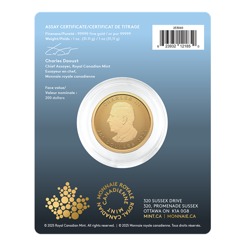 Price is subject to change without notice. Represents minimum guaranteed weight. The Royal Canadian Mint reserves the right to refuse or limit orders, and to change its prices and product offerings without notice if, for any reason, it should be found necessary to do so. The Mint also reserves the right to impose purchase quantity limits on certain items. Once an order is placed, it cannot be cancelled. Premium Bullion Products in special packaging are final sale (they cannot be returned or exchanged and are not eligible for refund for any reason). Exceptionally, in the event of a damaged, defective or incorrect product purchased through the Mint online (whether by mobile app or on mint.ca) or via the call centre, you may contact the Mint’s Customer Service Solutions Centre within 14 calendar days after shipment to request an exchange for the same product originally purchased (subject to product availability), where the Mint will, at its discretion, evaluate exchange requests on a case-by-case basis.