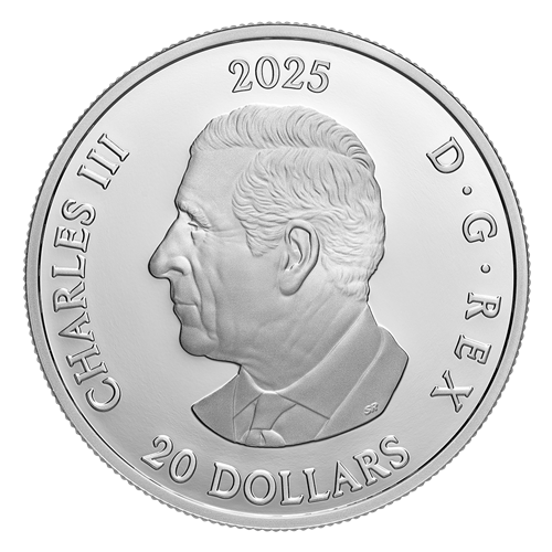 The reverse design by Canadian artist Ardell Bourgeois highlights the incredible story of the Avro CF-105 Arrow through its aerial view of the 1950s supersonic interceptor jet in flight. The view is of the first Arrow, indicated by the serial number “RL-201” (paired with the Royal Canadian Air Force classic roundel) on both the aircraft’s fuselage and in the inscription near the bottom of the design, just above the face value (“20 DOLLARS”) and year (“2025”). The image pays homage to the development of Canada’s most legendary aircraft, depicting the Arrow flying over the waters of Lake Ontario, where the small scale models were tested. This is represented by the Arrow’s outline, which is engraved incuse on the surface of the water, where it invokes the achievements that made it’s creation possible and contributed to aeronautics. The obverse features the effigy of His Majesty King Charles III by Canadian artist Steven Rosati.