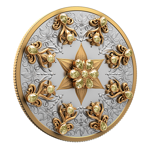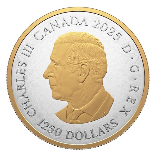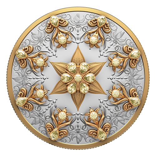 Designed by Canadian artists Chris and Rosina Reid, the coin’s engraved reverse celebrates the Canada lily (Lilium canadense) and is adorned with 14 pear cut and nine round cut fancy yellow diamonds (minimum total carat weight of 6.13) set in 18-karat gold mounts. Seven of those diamonds form the bejewelled centre of the largest lily, which is surrounded by eight additional jewelled appliqués and engraved elements that, together, show the lily in various stages of growth. A line-art representation of this arrangement appears on the obverse, which features the effigy of His Majesty King Charles III by Canadian artist Steven Rosati.