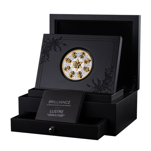 Your coin is encapsulated and ready to be placed inside a matte black wooden presentation case built by Canadian manufacturer Manubois. Inside the main compartment, you’ll find an elegant lily-themed coin insert that easily slides into the accompanying wood stand for an upright display. An additional tray holds a dusting cloth and a pair of archival gloves for safe coin handling; a welcome letter from the President and CEO of the Royal Canadian Mint; and certificates of authenticity issued separately by Crossworks Manufacturing for the diamonds, and the Royal Canadian Mint (for the coin) in the form of a serialized booklet. To minimize the risk of damage during transit, the coin, display stand and presentation case are all packaged separately but shipped together in one box for a memorable unboxing experience.