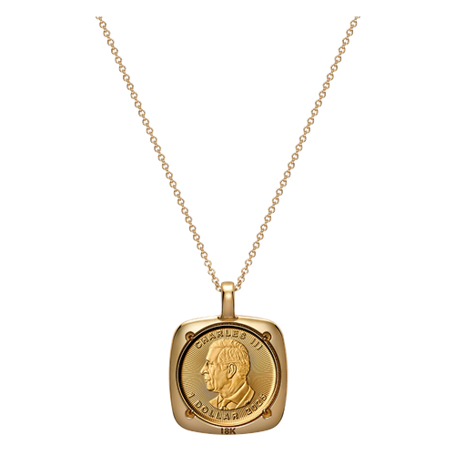 This statement piece consists of a Gold Maple Leaf (GML) bullion coin, a globally recognized investment piece, cradled in an 18K gold pendant and suspended from a matching 18K gold chain. The 24K gold coin features the classic GML bullion design by Walter Ott, with a single sugar maple (Acer saccharum) leaf backed by vivid radial lines, and with the effigy of His Majesty King Charles III by Steven Rosati on the obverse.