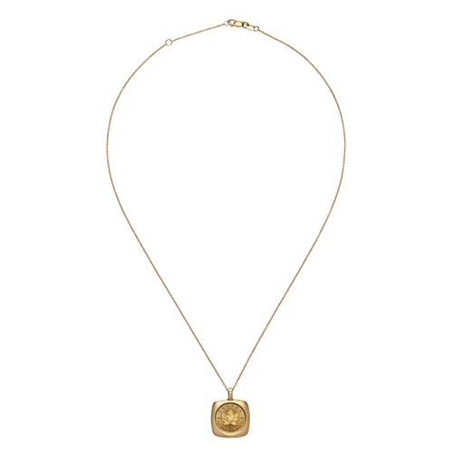 Revered for its exceptional purity, the 99.99% pure gold GML coin—here, in a 1/20 oz. size—gleams at the heart of the pendant, crafted with precision in Canada. Set in 18K gold and suspended from a matching chain, the GML is preserved in its original state, ensuring an unobstructed view of Walter Ott’s iconic maple leaf design in all its detail for all to admire.