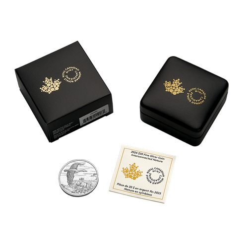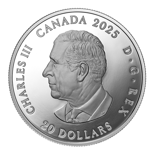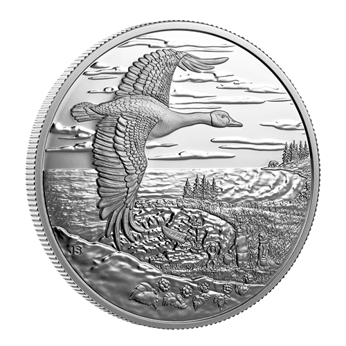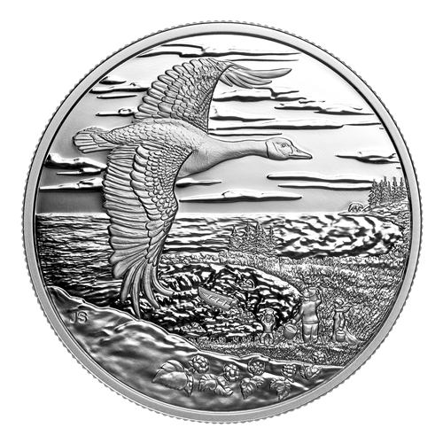 Designed by Jason Sikoak, an Inuk artist originally from Kikiak/Rigolet, Nunatsiavut, N.L., your coin’s reverse features the artist’s interpretation of the Inuit concepts of interconnectedness and coexistence with nature. Returning from the mud flats where the tide is rising, a Canada goose (Branta canadensis) —one of Canada’s most recognizable migratory species—is positioned in the foreground, where its flight alludes to the coming change of season that is part of nature’s cycle. Below, a family waits to catch the rising tide, having travelled by boat to gather their winter stores of akpik (cloudberries), which are plentiful enough to attract other species, including the black bear appearing on the far-off shore near the edge of the forest. The obverse features the effigy of His Majesty King Charles III by Canadian artist Steven Rosati.