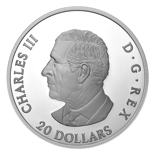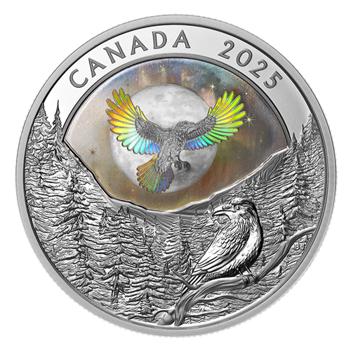 The story on your coin’s reverse was developed in collaboration with Nunatsiavut artist Bronson Jacque, who presents a new interpretation of the traditional Raven figure of Inuit legends. Realistically depicted on the lower engraved portion of the design, a raven perched on a branch and surrounded by trees represents each of us, grounded in our sense of self. The other, rendered in bas-relief, gleefully soars high into the sky upon realizing they are Raven, Creator of Life. An achromatic hologram—a three-dimensional image created with nanotechnology-based imagining—softens the full moon’s features and captures its magnificent luminosity, while the aurora borealis dances in the night sky. The spectrum of colours seemingly shifts depending on the viewing angle, creating the illusion of motion as it illuminates the raven’s feathers. The obverse features the effigy of His Majesty King Charles III by Canadian artist Steven Rosati.