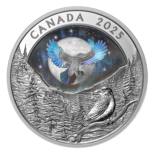 Benevolent creator and mischief maker, bringer of light and keeper of secrets: the Raven plays a central role in many Inuit legends. These stories are passed down to each new generation of artists and storytellers, inspiring them to create beautiful interpretations of these timeless tales, as seen on this 99.99% pure silver coin. Developed in collaboration with Nunatsiavut artist Bronson Jacque, this coin’s reverse design simultaneously honours the Raven of legends while presenting a new, original take: here, the engraved raven is a representation of our grounded selves, while the hologram-enhanced raven speaks to the power of storytelling and its ability to lift our creative spirits to new heights.