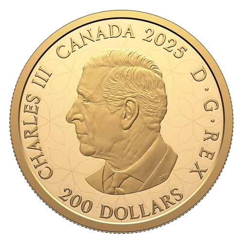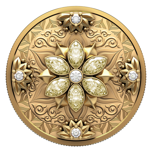 Designed by Canadian artist Simon Ng, the engraved art on the coin’s reverse surrounds a jewellery adornment shaped like a Canada lily (Lilium canadense), its tepals formed by six marquise-cut fancy yellow diamonds (minimum total carat weight of 1.14) that surround a round-cut white diamond at the centre, all set in an 18-karat gold mount. The bejewelled centrepiece sits atop an engraved sunburst; inspired by the compass star, the sunburst radiates light across the arrangement of stylized plant elements and towards the four sun-like flowers representing the cardinal directions along the edge, where each one is adorned with a round cut white diamond. An engraved lily shape forms a repeating pattern on the obverse, which features the effigy of His Majesty King Charles III by Canadian artist Steven Rosati.