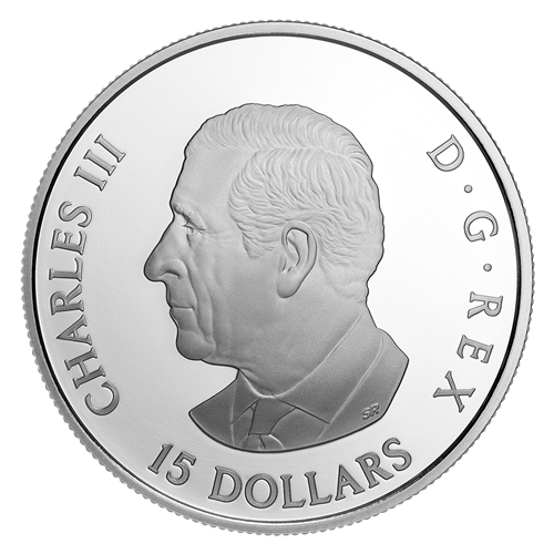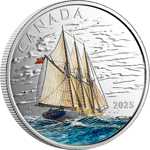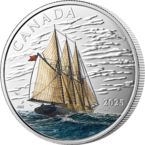 Enhanced with selective colour, the reverse design by Canadian marine artist John M. Horton features a starboard quarter view of a three-masted (tern) schooner under full sail on a close reach in a smart breeze, with the starboard side lifting as the ship rolls to port. A full cargo of lumber is stowed on the deck of this coastal freighter, while the patent log is towed astern to measure speed and distance run. The obverse features the effigy of His Majesty King Charles III by Canadian artist Steven Rosati.