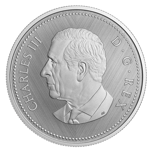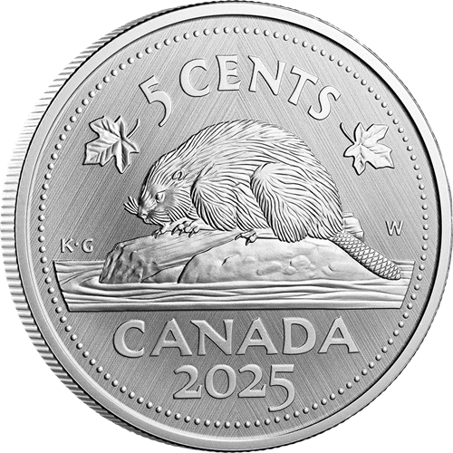 A numismatic tribute to Canada’s five-cent circulation piece, this all-silver coin’s reverse features George Edward Kruger Gray’s classic beaver design, along with the “W” (Winnipeg) mint mark denoting where this coin was struck. The obverse features the effigy of His Majesty King Charles III by Canadian artist Steven Rosati.