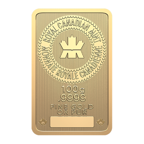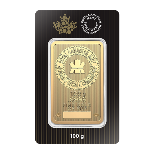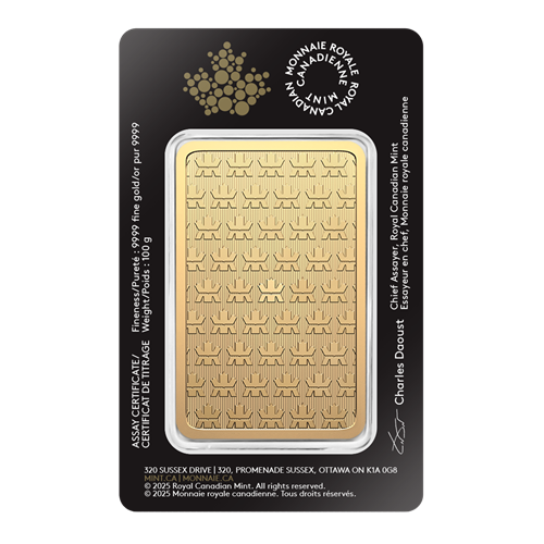 The Royal Canadian Mint’s new one-hundred gram gold bar includes the latest, most advanced security enhancements. Expect the same unsurpassed quality and guaranteed craftsmanship as other Royal Canadian Mint bars, including a market-leading purity (.9999 fine) that is a testament to the Mint’s world-famous minting and refining capabilities.