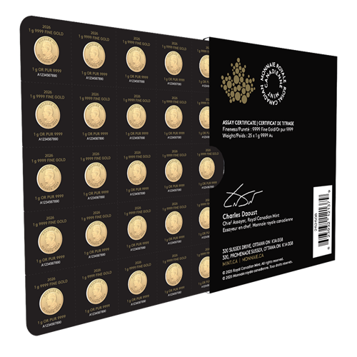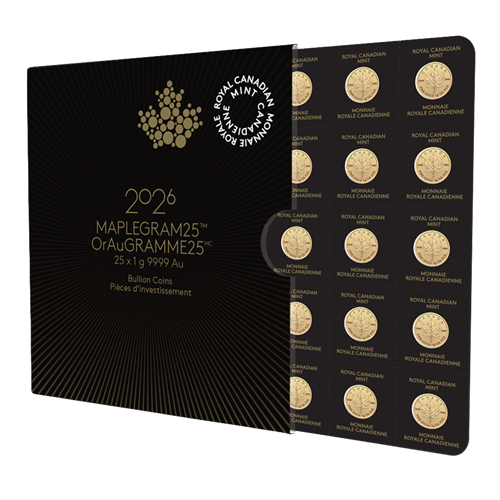 The Royal Canadian Mint is proud to launch the 2026 Maplegram25ᵀᴹ, a composite of twenty-five GML coins each weighing 1 gram of 99.99% pure gold, packaged in a divisible blister pack wrapped in an elegant sleeve. Each coin blister has a distinct serial number, and the assay certificate on the sleeve certifies the purity and weight of the coins.