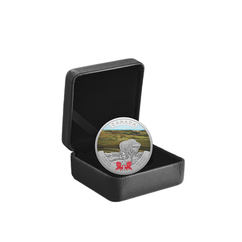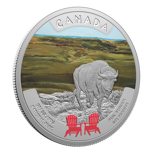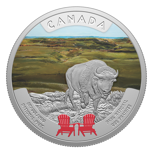 Designed by Canadian artist Kerri Burnett, your coin’s reverse invites you to take a seat and enjoy the view from Grasslands National Park, located in southwestern Saskatchewan. A mighty plains bison (Bison bison bison) appears in the engraved foreground, while behind it, selective colour captures the serene beauty of the open prairie landscape, as it extends into the horizon under a clear blue sky. Selective colour also highlights two red Adirondack chairs—a familiar sight in Canada’s national parks. The obverse features the effigy of His Majesty King Charles III by Canadian artist Steven Rosati.