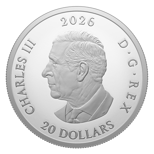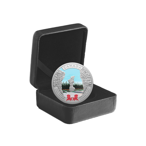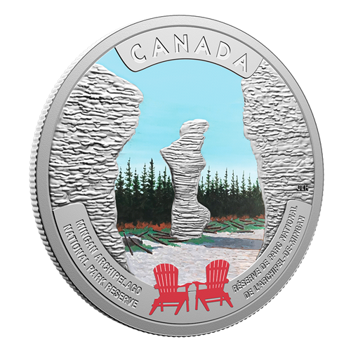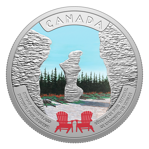 Designed by Innu artist Jean-Luc Hervieux, your coin’s reverse invites you to take a seat and enjoy the view from Mingan Archipelago National Park Reserve, located in the province of Quebec and just off the northern coast of the Gulf of St. Lawrence. The design highlights the park’s vast collection of monoliths by presenting a view of the famous Bonne Femme formation (centre) on Île Niapiskau, one of the park’s many islands and islets. Selective colour highlights the surrounding landscape and, in the foreground, two red Adirondack chairs—a familiar sight in Canada’s national parks. The obverse features the effigy of His Majesty King Charles III by Canadian artist Steven Rosati.