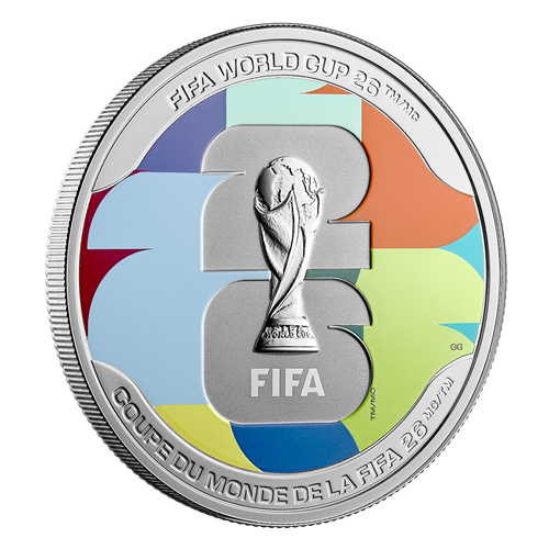 For the first time ever, the FIFA World CupTM/MC spans three countries—Canada, Mexico, and the United States—bringing the world’s biggest sporting event to a new, unprecedented stage. The only coloured collector piece with colour in our FIFA World Cup 2026TM/MC collection, this 1 oz. 99.99% pure silver coin features a design inspired by the official emblem. A mark of energy, pride and unforgettable moments, the iconic trophy is set against a vibrant background, where the boldly coloured hosting year (“26”) captures a moment the world will remember.