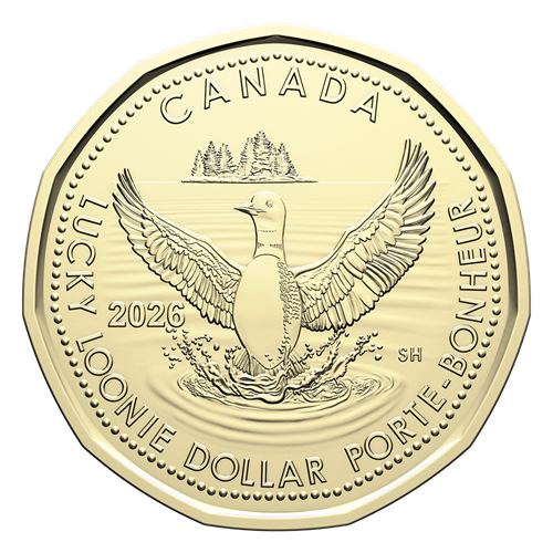 - A fresh design. Your 2026 Lucky Loonie features a Loon with wings raised in a "V" for victory, splashing into the water below. This elegant design symbolizes grace and triumph, making it a cherished addition to any collection.