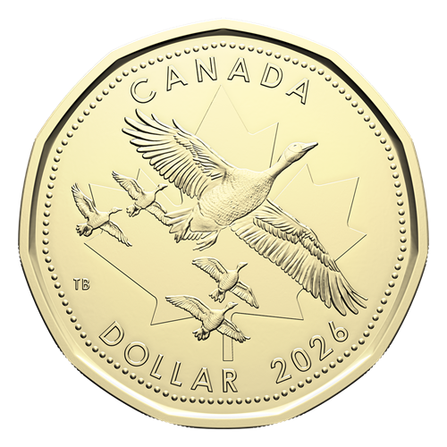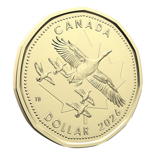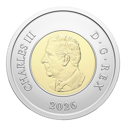 Look up at the sky—designed by Canadian artist Tony Bianco, the $1 coin in the 2026 O Canada Gift Card Set features a patriotic flyby backed by a maple leaf, with five Canada geese positioned in the flying V-formation that is a familiar sight in our skies each spring and fall, during the species’ migratory flights. The obverse features the effigy of His Majesty King Charles III by Canadian artist Steven Rosati.