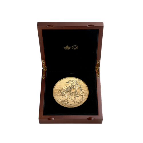 Your pure gold kilo coin is encapsulated and presented in a Royal Canadian Mint-branded wooden case with a black beauty box. It is accompanied by a custom-made shadowbox, as well as a special insert card featuring a reproduction of the original artwork and a quote from Katerina Atanassova, Senior Curator of Canadian Art at the National Gallery of Canada in Ottawa, where the iconic painting is on display.