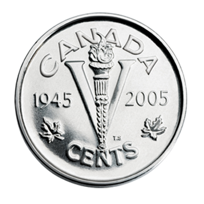 The 2005 five-cent circulation coin honours the 60th anniversary of the end of the Second World War, and features the coin’s original design by Thomas Shingles.