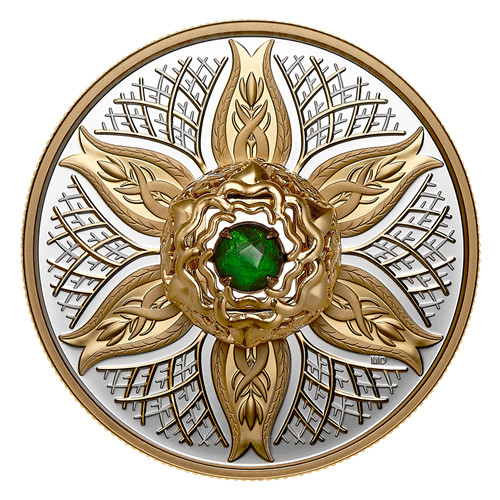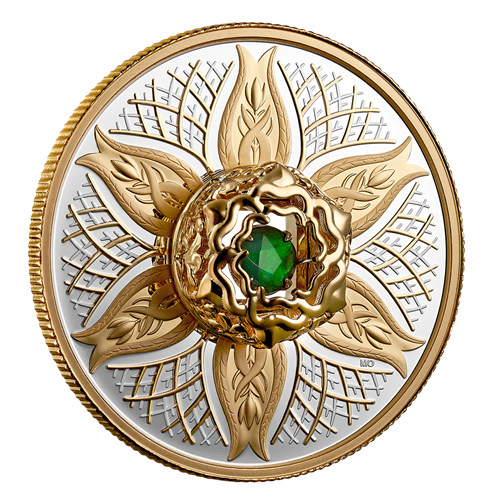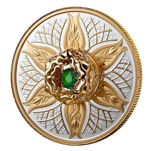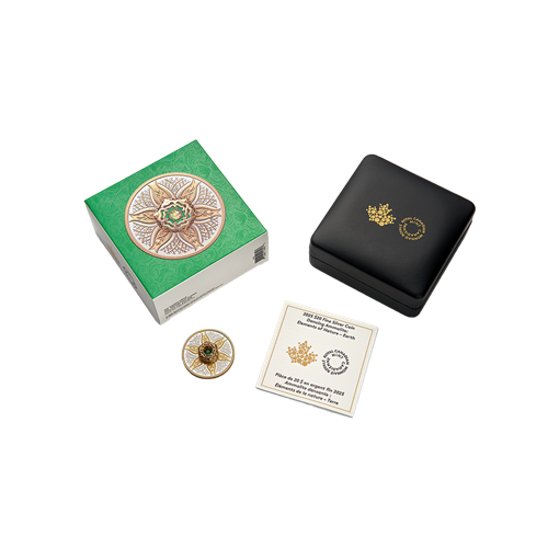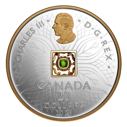 Enhanced with selective gold plating, the reverse design by Canadian artist Mariya Olshevska is a representation of the Earth element in nature. A spring blossom contained within a bulb-like shape symbolizes nature’s cyclical renewal; as a repeating motif, it forms the petals of a larger flower shape, while the overlapping arrangement of tree branches and roots is representative of steadfast growth. At the centre, a standard grade ammolite that has been ethically sourced from Alberta’s Bearpaw Geological Formation is set in a 3D mount fashioned by Canadian jewellery manufacturer Beverly Hills Jewellers; the gold-plated setting allows the suspended gemstone to “dance” at the slightest movement of the coin base. The obverse features a stylized version of the engraved reverse, as well as the gold-plated effigy of His Majesty King Charles III by Canadian artist Steven Rosati.