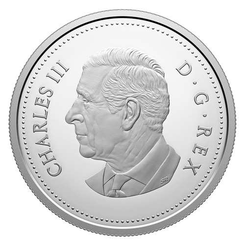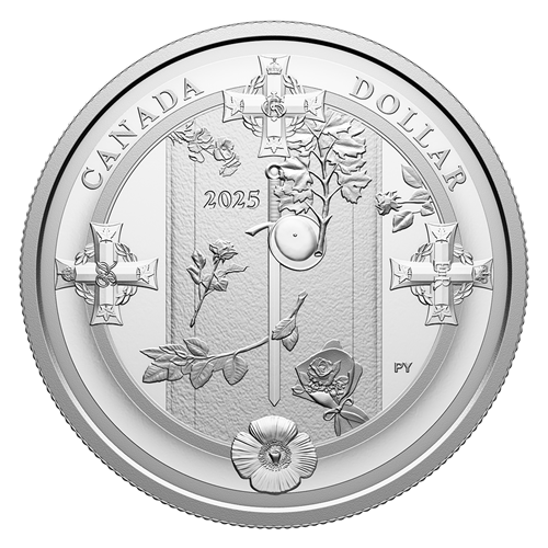 Le motif au revers, œuvre de l’artiste canadienne Pandora Young, présente une vue en plongée des trois paliers de la Tombe couverte de fleurs du Soldat inconnu, située au Monument commémoratif de guerre du Canada à Ottawa, en Ontario. Les trois anneaux font référence aux trois paliers du sarcophage en granite foncé Calédonia, lequel est représenté au centre du motif, et les quatre ornements à la base de la Tombe – trois sont une réplique (en argent) de la Croix du Souvenir, chacune ornée d’un monogramme royal des différents monarques ayant régné depuis la création de la décoration en 1919 (George V, George VI, Elizabeth II), et la dernière, un coquelicot – sont joliment positionnés au pourtour de la pièce, créant cette composition circulaire qui met en valeur la vue en plongée. La sculpture en bronze qui recouvre la tombe est aussi représentée sur le motif : des rameaux d’érable et des feuilles de laurier entourent l’épée médiévale et le casque de la Première Guerre mondiale et sont accompagnés de roses et de coquelicots (à la position 11 heures) pour commémorer celles et ceux qui ont donné leur vie au service de leur pays. L’avers est à l’effigie de Sa Majesté le roi Charles III, selon l’artiste canadien Steven Rosati.