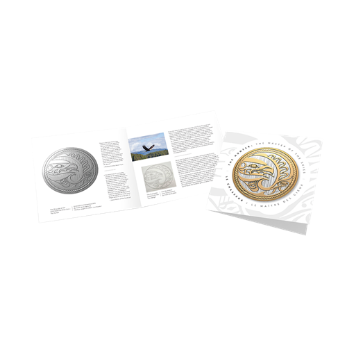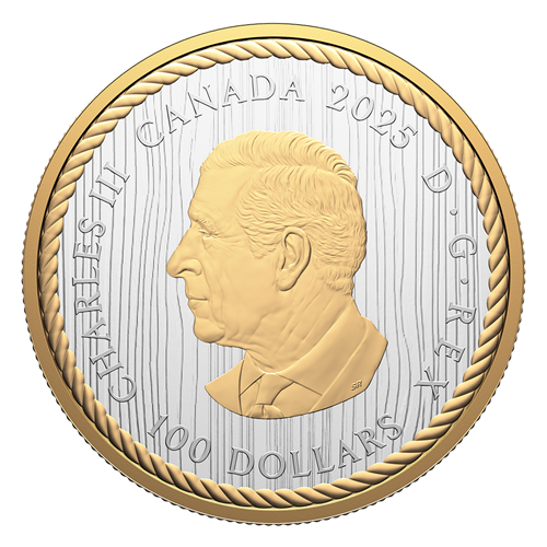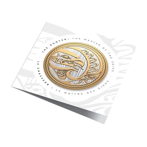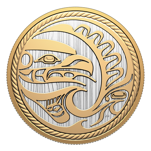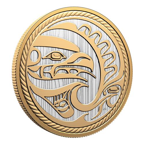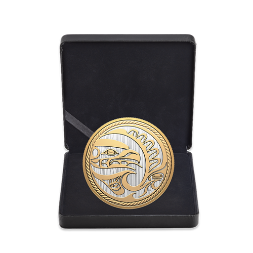 Le motif inspiré d’un panneau sculpté kwakiutl de la pièce Le chasseur de 2024 est superbement reproduit sur cette pièce de 2025, dont le plus grand diamètre (76,25 mm) donne plus d’espace au maître des cieux pour voler toutes ailes déployées. L’Aigle resplendit ainsi rehaussé d’un placage d’or jaune, tout comme la nageoire de l’Épaulard qui fend les vagues en contrebas. Les deux côtés de la pièce présentent un champ gravé imitant le grain droit du cèdre rouge de l’Ouest, et la bordure rappelant de la corde de cèdre torsadée a été légèrement rapprochée pour enserrer de plus près cette œuvre d’art kwakiutl contemporaine de 10 oz.